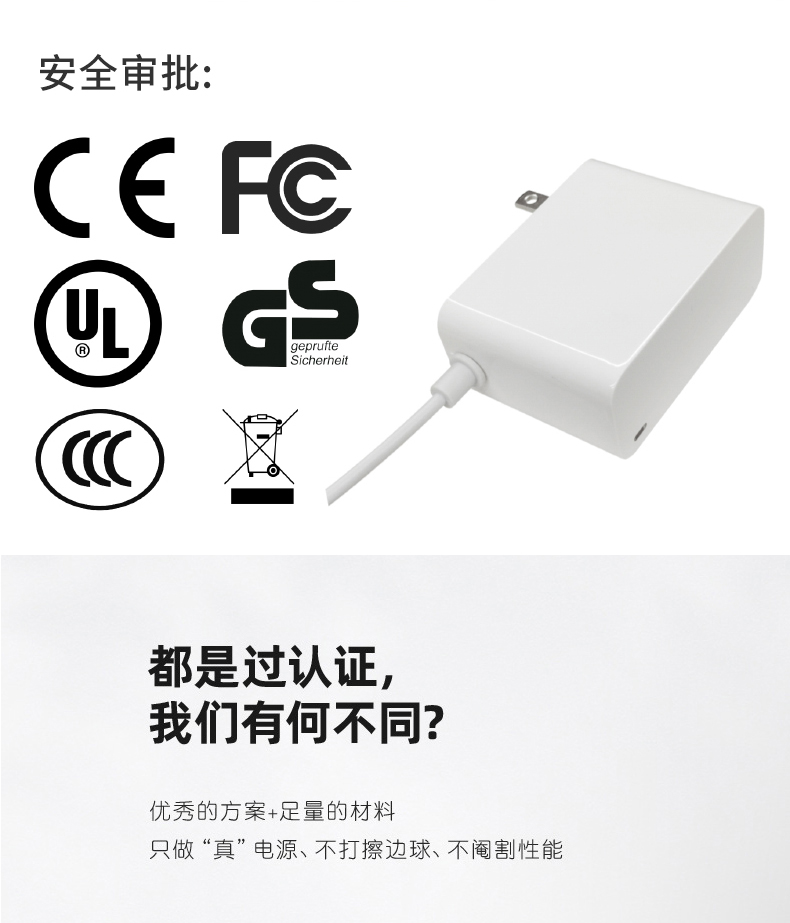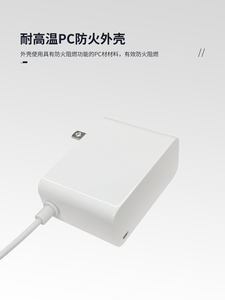此款电源适配器的外壳采用高品质的PC防火材料制造,能够有效防止火灾发生,提高使用安全性。同时也具有好的耐用性和抗老化性能,能够长时间保持使用效果,降低更换成本。