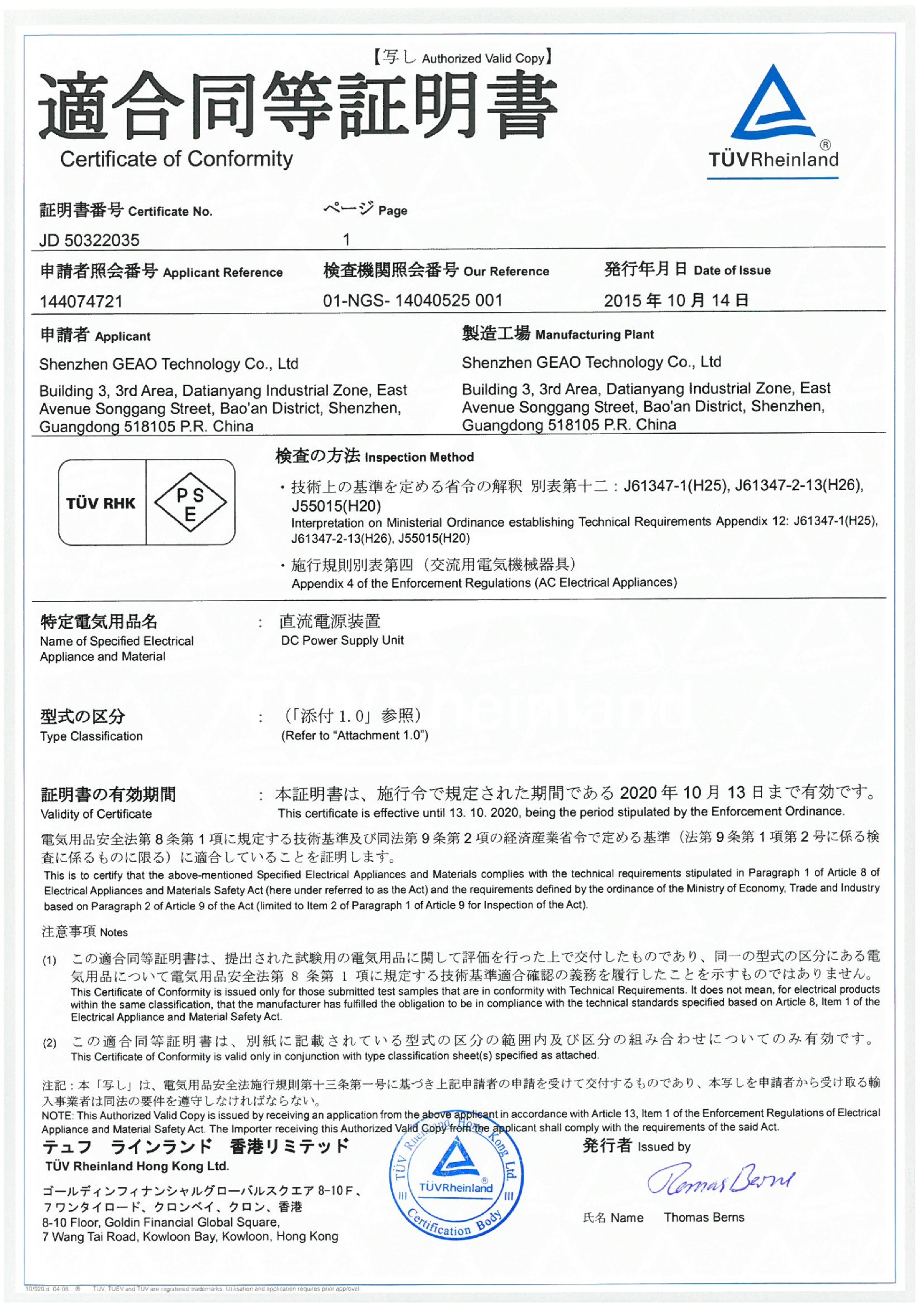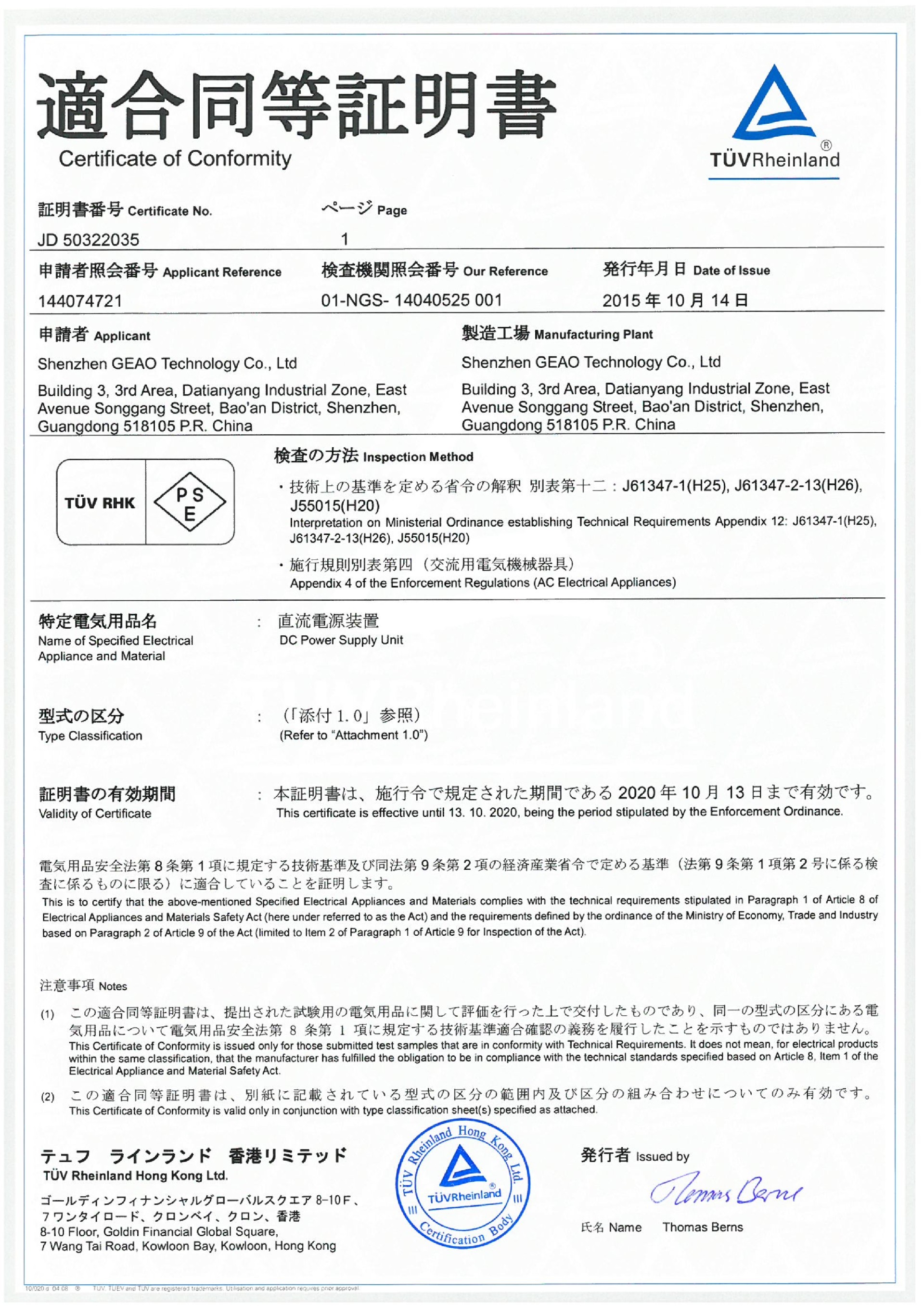 本产品已经符合了适用的日本的PSE指令和标准,并且已经通过认证机构的评估和测试。该产品的设计、制造和性能满足了相关的安全要求。